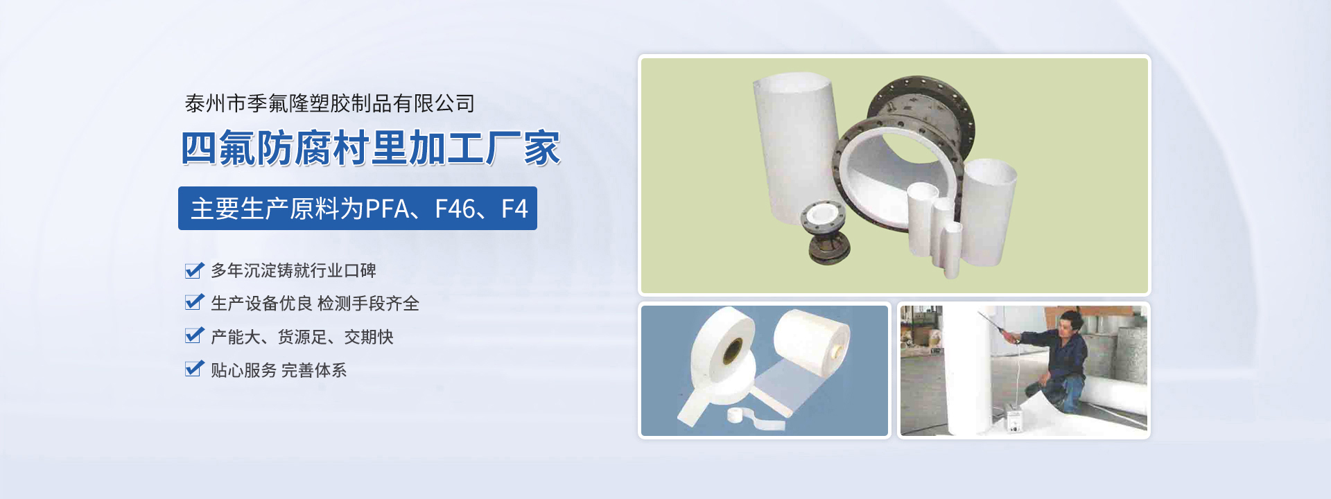 泰州市季氟隆塑膠制品有限公司(江蘇斯瑞沃爾科技發(fā)展有限公司)占地8000平方米,各類(lèi)專(zhuān)用生產(chǎn)設(shè)備三十多合,現(xiàn)有員工近20人,其中技術(shù)人員10名,均多年從事該行業(yè)生產(chǎn),經(jīng)驗(yàn)豐富。本公司主要生產(chǎn)原料為PFA、F46、F4,主要為電磁傳感器、防腐管道、各種容器反應(yīng)釜三通四通彎頭及各種閥門(mén)等產(chǎn)品進(jìn)行防腐村里加工,長(zhǎng)期為德國(guó)、日本、美國(guó)、新加坡等國(guó)在華合資公司配套,產(chǎn)品廣泛應(yīng)用于環(huán)保、油田、化工、造紙、冶金等行業(yè),產(chǎn)品質(zhì)量?jī)?yōu)良,服務(wù)及時(shí)周到,一直深受顧客信賴。